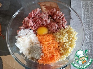 Фарш, булгур, лук, морковь, яйцо, манную крупу, соль и перец кладём в глубокую миску и тщательно вымешиваем. Можно добавить полстакана воды, если фарш покажется суховатым.