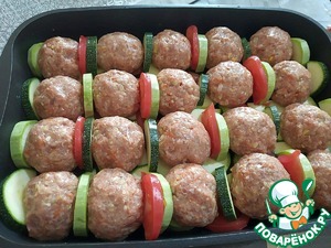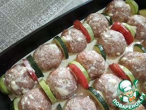 Из фарша формируем мясные шарики и укладываем на овощи. Между тефтельками помещаем оставшиеся овощи.