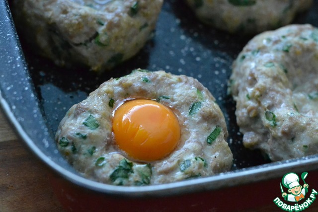 • Противень с котлетами достать из духовки и, аккуратно в каждое углубление, вылить яичный желток.