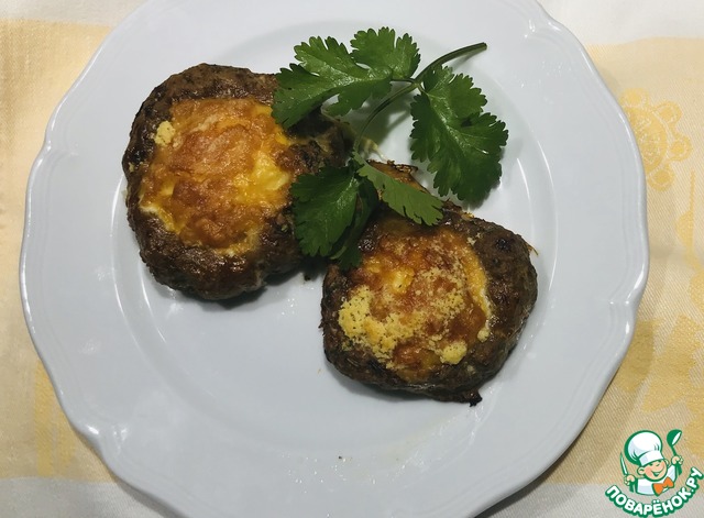 Спасибо за идею! Я обошлась одним яйцом, которое взбила, соединила с сыром натертым на терке и ложкой разложила в углубления почти готовой котлетки. Запекла. Очень вкусные котлетки получились!