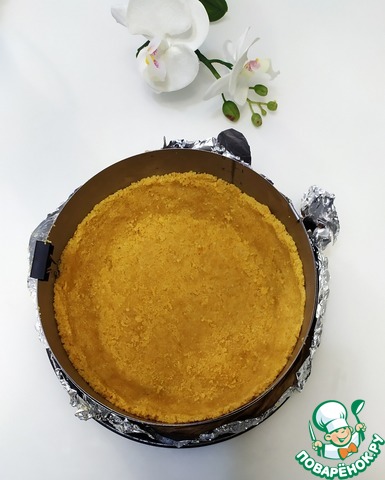 Кондитерское кольцо, диаметром 19 см, обернуть пергаментной бумагой, а затем фальгой. Выложить половино части крошки в кондитерское кольцо, или разъемную форму. И довольно плотно утрамбовать дном стакана. Затем по бокам выложить оставшуюся крошку и сформировать бортики с помощью стакана. Готовую основу ставим на 5-10 минут в холодильник, а за тем на 10 минут разогретую до 180-200°С духовку.
