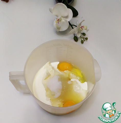 В чаше соединить плавленный сыр, сахар, яйца, сливки. Все ингредиенты комнатной температуры. Взбить блендером до однородной массы.