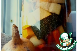Сложить всё в банку слоями. Засыпать соль (одну столовую ложку на одну литровую банку), залить эссенцию (около 1 ст. л. на литровую банку). Все это залить кипятком и закрыть крышкой. Я использовала обыкновенные банки от майонеза, джемов, солений, купленных в супермаркете.