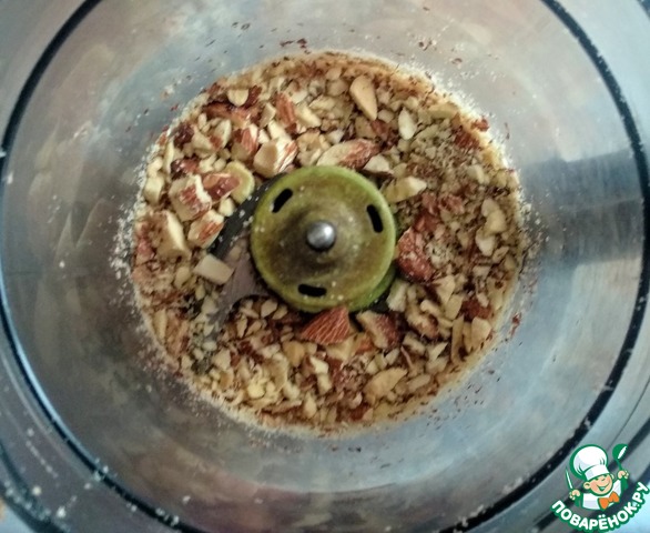 Измельчить, но не в крошку, чтобы оставались кусочки орешков. Фисташки я нарезала на кусочки ножом.