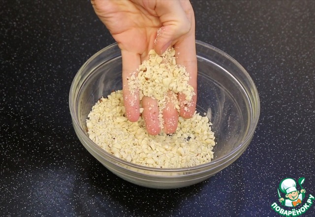 Сверху присыпаю орехами. То, что упало рядом подвигаю с помощью лопатки.