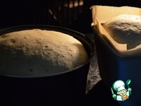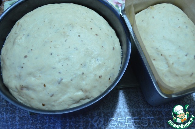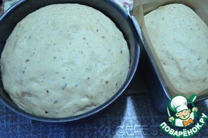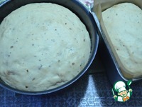Тесто накрыть, убрать на 1 час в тёплое место, для выбраживания. Затем тесто обмять, выложить в форму, смазанную маслом или силиконовую. Я разделила тесто на 1/3 и 2/3, пекла два хлеба. |