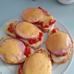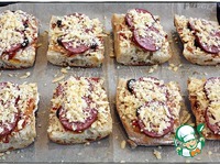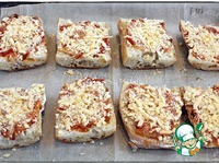 Но в процесс приготовления не так прост и быстр. Кусочки багета толстоваты и качаются как лодочки, чтобы начинка не соскользнула, пришлось подпирать кусочками хлеба или срезать нижнюю корочку и делать из неё минипиццебутер (где вы берете плоский багет?). Начинку наносить многослойно на небольшие кусочки гораздо дольше, чем на один большой пирог. На всё ушло не меньше получаса, хотя кто-то может сказать, что это именно со мной что-то не так.