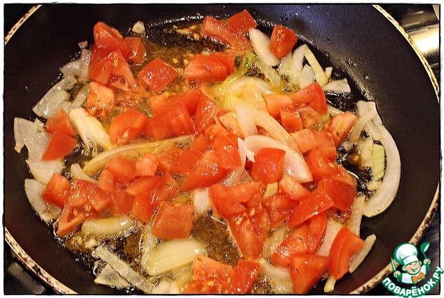 Разогреваем сковороду с небольшим количеством масла, выкладываем лук и обжариваем буквально секунд десять-двадцать, добавляем помидоры и тушим минуты полторы. |