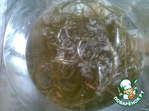 Морскую капусту закинуть в горячую воду на 30 мин, потом хорошо промыть в холодной воде от слизи