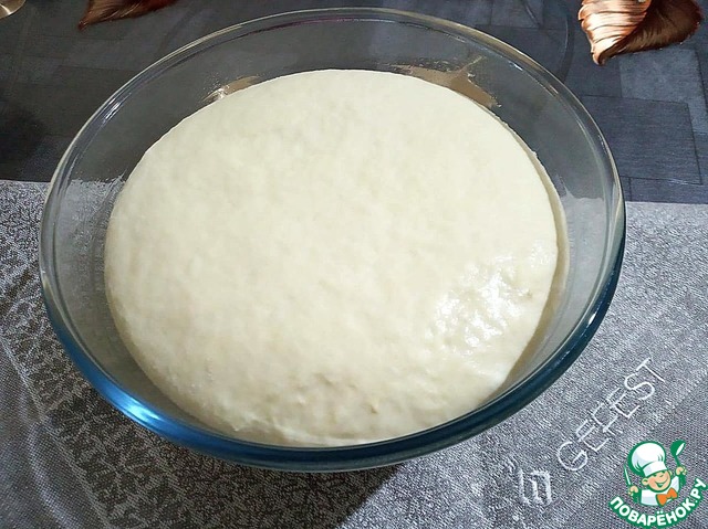 В дрожжи добавляем сахар, тёплую воду и оставляем "распускаться". В просеянную муку (может понадобиться чуть больше или меньше) добавляем все указанные ингредиенты и замешиваем довольно мягкое тесто. Оно должно чуточку прилипать к рукам. Прикрываем миску и отправляем тесто "подниматься" в тёплое место.