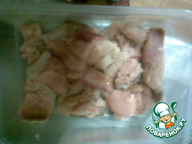 Филе сельди, порезать на мелкие кусочки, уложить в пластиковую посуду |