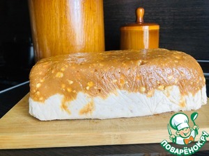 4. В форму выкладываем сгущёнку с арахисом, ровным слоем, делая небольшие бортики.