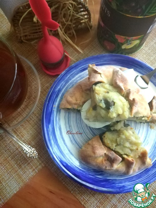 Начинку можно сделать заранее. Можно взять готовое картофельное пюре с жареными лесными грибами и репчатым луком в сливочном масле, которое осталось со вчерашнего дня. Картофель отвариваем до готовности в подсоленной воде, сливаем воду, делаем пюре. Грибы разморозила, нарезала небольшими дольками и отварила 15 минут в подсоленной воде. На сковороде растопила сливочное масло, выложила лук репчатый порезанный произвольно, позолотила до мягкости. Выловила из бульона шумовкой грибы и отправила к луку. Обжарила всё немного до полного выпаривания жидкости из-под грибов. Отправила в пюре картофельное и всё соединила. Я делала вечером и на утро оставила немного этого пюре для галеты. Галета у меня будет небольшая, раскатанное тесто для неё D~22 см и для начинки мне потребуется ~ 5 ст л пюре.