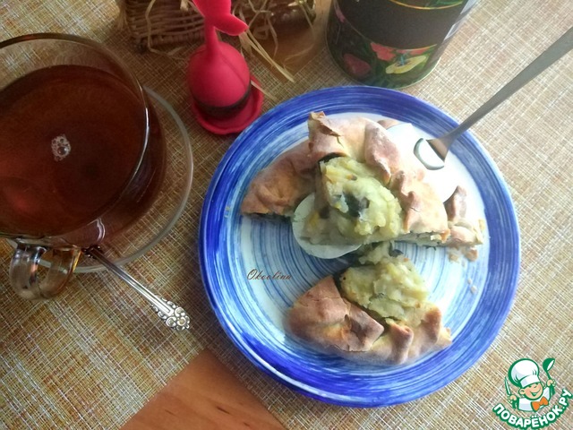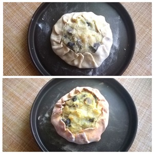 Отступая от края 3-4 см примерно, выложила начинку. Сформировала края галеты. Галета получилась D~18 см. Я её не смазала сверху ни маслом, ни желтком. Поставила в духовку на 30 минут при т-180 С. Время для выпечки мне понадобилось меньше, как только края у теста подсохнут и зарумянятся, можно вынимать галету из духовки. Начинка у нас полностью готова.