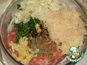 • в фарш добавляем порезанный мелко лук, 1-2 выдавленного зубчика чеснока, соевый соус, соль, перец, паприку, базилик, орегано, мелко рубленую зелень петрушки и натертый на мелкой терке сырой картофель. Все хорошо перемешать и добавить молока столько, чтобы не был сухой, но и не сильно жидкий, держал форму.
