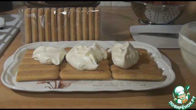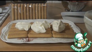 Собираем торт. Я делала с печеньем Савоярди, с ним ещё делают Тирамису. Можно испечь бисквит. Обмакиваем с одной стороны, буквально на одну секунду печенье в молоке и выкладываем на блюдо. Первый слой выкладываем по пять печений в три ряда.