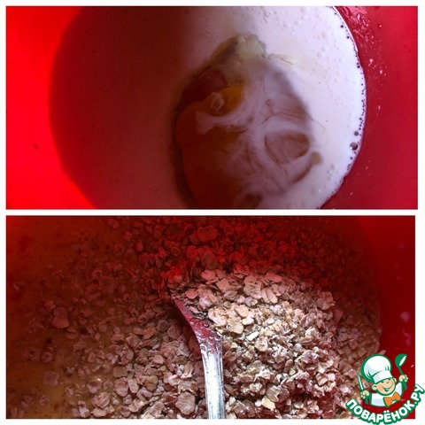 Вилкой взбить молоко с яйцом. Всыпать овсяные хлопья, перемешать и оставить набухать на 20 минут.