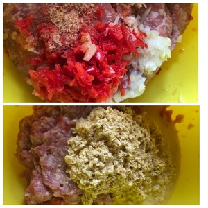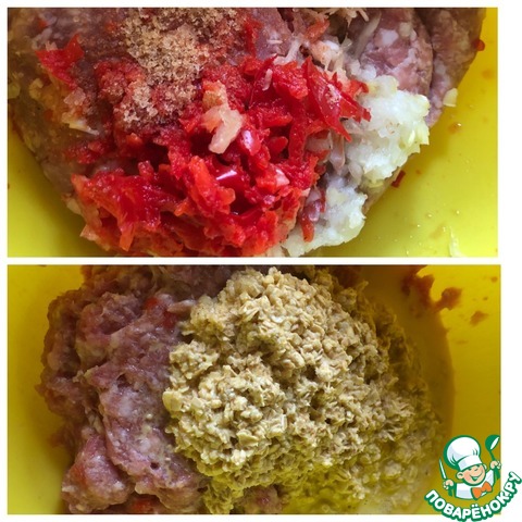 К фаршу добавить чеснок пропущенный через пресс, лук и перец натереть на крупной тёрке. Добавить соль, молотый перец и вымесить фарш. Добавить набухшую овсянку и ещё раз тщательно вымесить фарш.