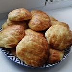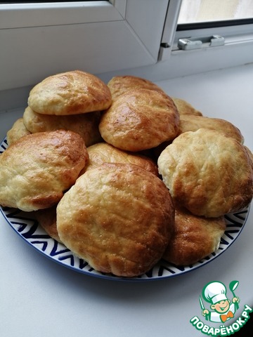 [+5]Приготовила строго по рецепту, только сахара положила ровно половину (110 г). Теста получилось 700 г, которые поделила на 20 кусочков, скатала из них шарики, выложила на противень, приплюснула, сделала ножом насечки и смазала яйцом. При выпечке коржики трансформировались в пышки