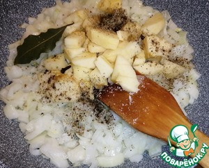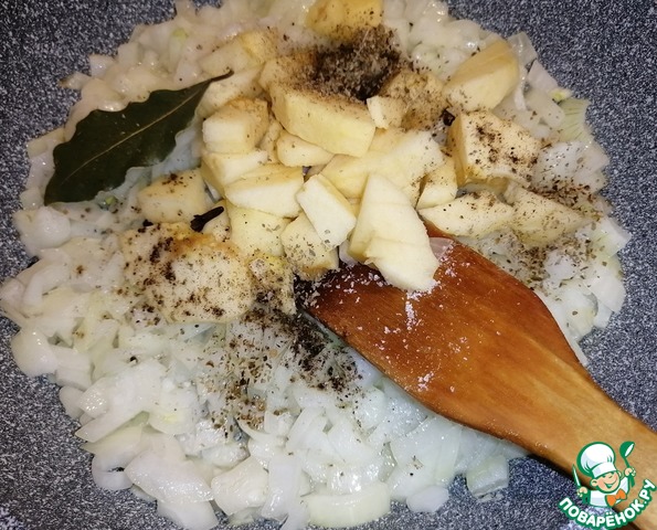 На разогретой сковороде растопить сливочное масло. Высыпать лук и обжарить 2 минуты. Кубиками порезать почищенное яблоко от кожуры, добавить к луку. Добавить лавровый лист, душистый перец, гвоздику, майоран, посолить и поперчить по вкусу. Жарить на медленном огне, изредко подливая воду, пока лук не станет золотистым, а яблоко мягким.