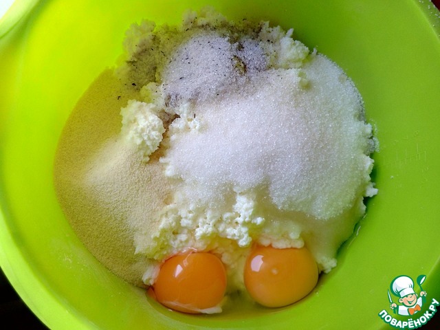 В большую миску сложить творог, 2 яйца, всыпать семолину, соль и сахар, влить молоко. Количество сахара можно уменьшить до 100 г, но если творог у вас кисловатый, то всё-таки лучше положить 150 г.