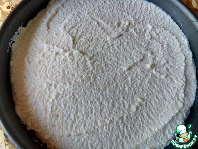Выложить творожную массу в форму и разровнять. Я обычно пеку либо в круглой форме диаметром 22 см, либо в прямоугольной размером 18х25.