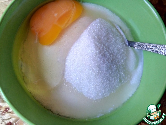 Пока запеканка готовится, смешать сметану с 50 граммами сахара и 1 яйцом до однородности.