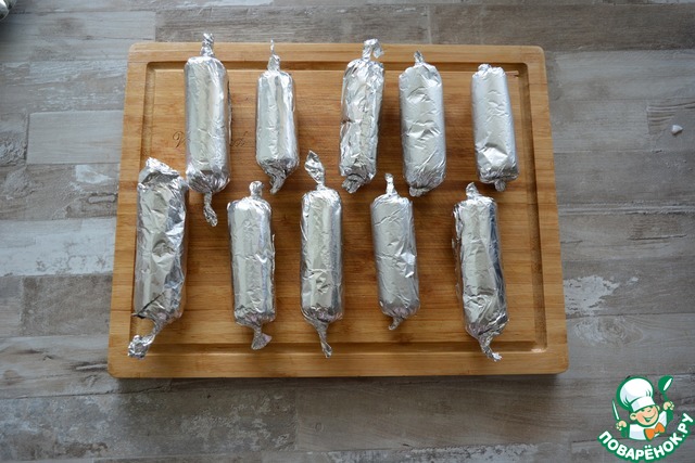 Оберните каждый рулетик плотно фольгой и заверните края как " конфетку".