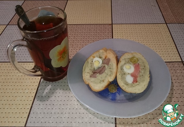 Я делаю такой бутерброд очень давно, наверно с 90-х. Можно считать это закуской и порезать на праздничный стол ломтиками, вынув сразу из холодильника. Я люблю на завтрак. Всё тут есть: яйцо; масло сливочное; батончик. Со свежим заваренным сладким чаем-просто сказочно.