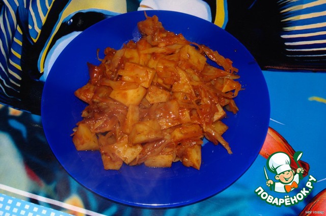 Думаю, что стоило закинуть картофель вместе с капустой или провести какие-то другие хитрые манипуляции, так как капуста совсем ужарилась, а картофель всё еще оставался очень крепким.