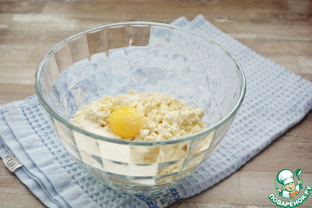 К творогу добавьте яичный желток, соль, сахар, ванилин -