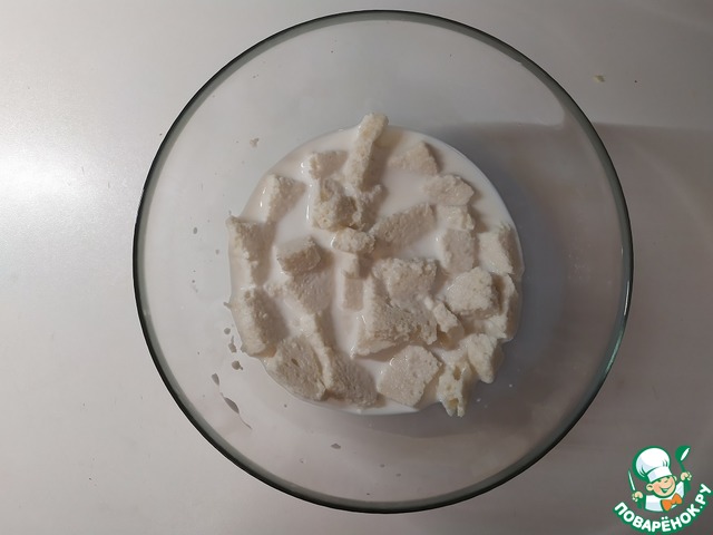С хлеба срезать корки, нарезать кубиками и замочить в молоке.
