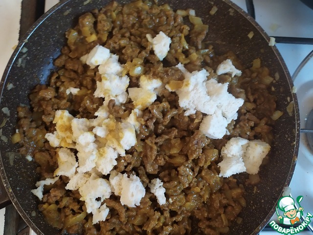 Отжимаем хлеб, добавляем, обжариваем. Молоко отставляем в сторону.