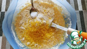 Затем добавляем цедру 1 лимона и пол чайной ложки соли, вымешиваем лопаткой. -