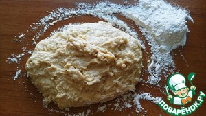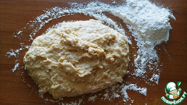 Тесто нежное и приятное в работе. Подпыляем мукой стол и стараемся не забить тесто мукой. У меня ушло ровно 500 гр муки, заявленных автором. Но мука у всех разная-у вас может уйти как больше, так и меньше. Главное- собрать тесть в шар. Много с ним работать нет необходимости.