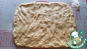 Подошедшее тесто выкладываем на стол и вытягиваем его руками. Затем раскатываем скалкой до толщины в 1 см. У меня получился прямоугольник сторонами в 35 и 54 см. На мой взгляд, уменьшив ширину до 30 см работать в дальнейшем будет удобнее.