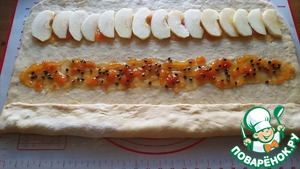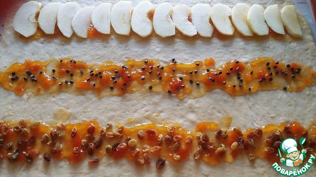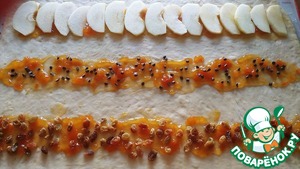 На раскатанный пласт теста наносим в три ряда абрикосовое варенье по 1-1,5 полной ложки, отступая от краев на 4-5 см. На первый ряд укладываем яблоки, на второй орехи (у меня замена на шоколадные капли) на третий - замоченный и отжатый изюм.