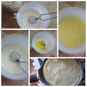 Делаем тесто. Налила кислое молоко в посуду, положила разрыхлитель и венчиком соединила. Добавила сахар, разбила яйцо, опять всё венчиком соединила и насыпала Геркулес. Размешала и дала ему 10 минут примерно разбухнуть. Добавила рисовую муку и соль. Тесто густое. Работая постоянно венчиков вливаем в тесто кипяток. Тесто должно быть довольно жидкое, чтобы оно тонким слоем хорошо разливалось по сковороде. Наливаем масло. Я использую оливковое. Это для того, чтобы не подмазывать каждый раз сковороду при выпечке блинов. Сковорода у меня D-24 см, антипригарная блинная. Хорошо её разогрела и разлила тесто тонким слоем. Обжариваем блин с одной стороны на среднем огне. Когда блин схватится (проверяем его от краёв лопаточкой)...