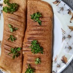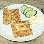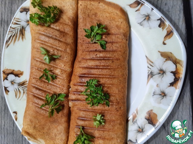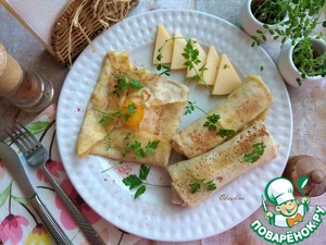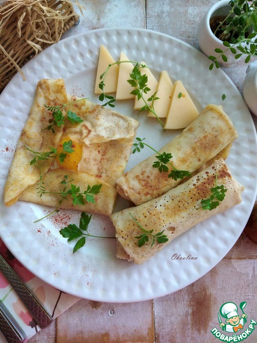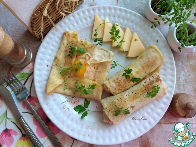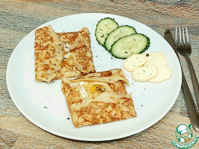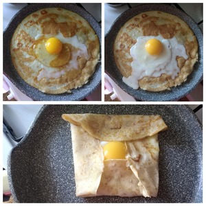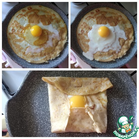 ... переворачиваем. На середину разбиваем аккуратно яйцо, чтобы не повредить желток. Убавляем огонь на минимум. Даём яйцу приготовиться. Затем заворачиваем края (см. на фото). Немного ещё обжариваем и снимаем сразу на тарелку для подачи.