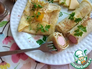 Из этого количества теста получится 4 шт блина D-24 см. Как раз на две порции - по 1 глазунье и по 1 сосиске.