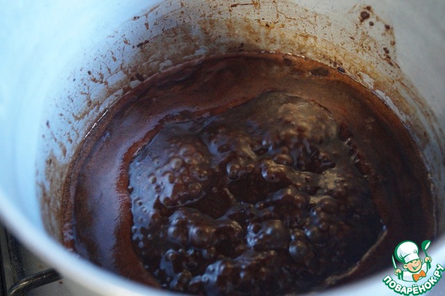 Приступаем к приготовлению шоколадного коржа. В сотейник кладем 90 г сахара, масло, воду и какао. Все перемешиваем и доводим до кипения.