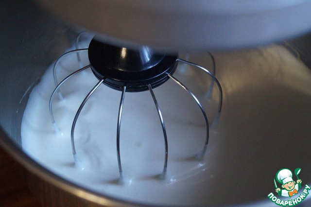Яйца взбиваем с оставшимся сахаром - 90г., до пышной массы.