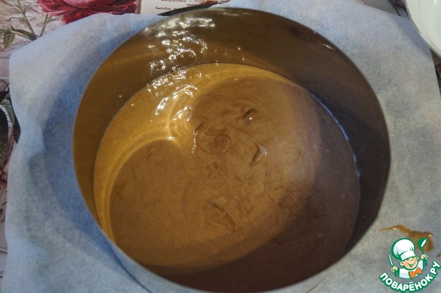 Берем форму или кольцо для выпечки диаметром 20-22см. Выливаем тесто и выпекаем шоколадный корж в духовом шкафу при температуре 170 градусов, до сухой шпажки.