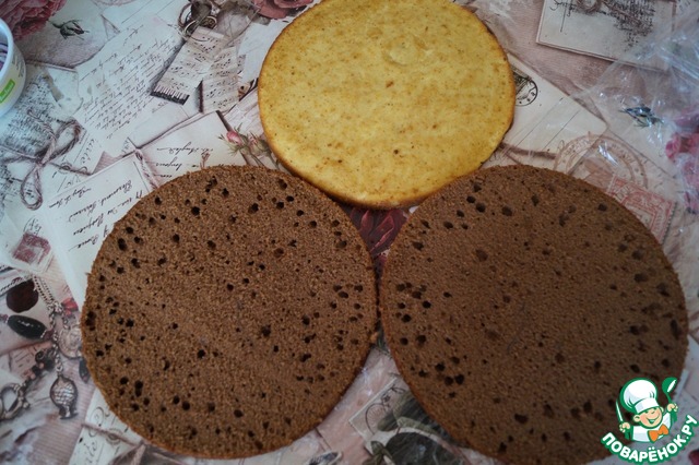 Утром коржи достаем из холодильника. Шоколадный бисквит разрезаем на 2 коржа. Апельсиновый оставляем как есть.