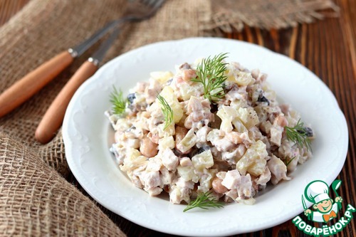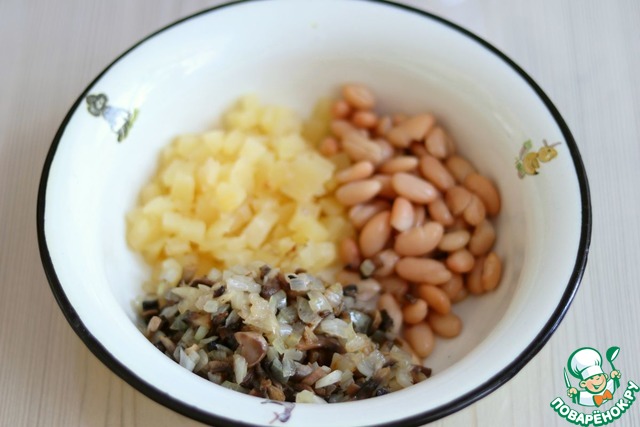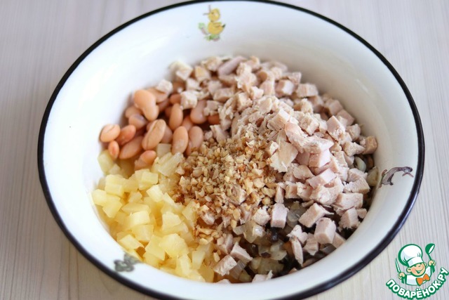 В миску добавить нарезанные ананасы, тушеные лук и шампиньоны, предварительно слить масло, в котором тушили лук и шампиньоны, в салате оно не нужно. Далее добавить консервированную фасоль (3 ст. ложки)