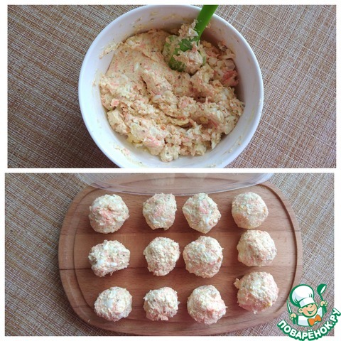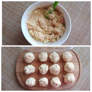 Сформировать шарики влажными ладонями, величиной примерно со средний грецкий орех. Шарики отлично формируются. Выложить шарики в подходящую посуду с крышкой и поставить перед подачей в холодильник минут на 30.