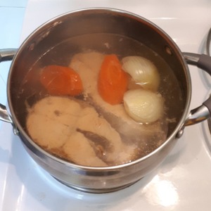 Желатин залить 100 мл воды, оставить набухать на 20 минут, затем распустить на водяной бане. Отлить 300 мл бульона и добавить растворенный желатин.