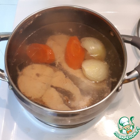 Следующий слой -рыба, заливаем бульоном и ставим в холодильник.