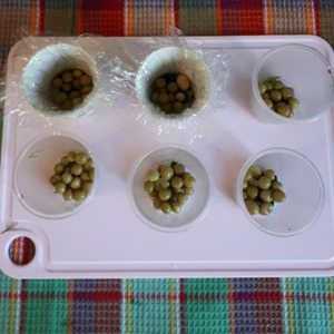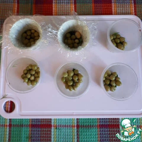 Буду делать заливное в стаканчиках, керамичечкие стаканчики выстелить пищевой пленкой, пластиковые не надо. На дно положить небольшую веточку зелени укропа, затем горошек, налить немного бульона с желатином и поставить в холодильник застывать на 30 минут.