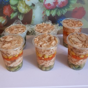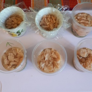 Итоговый слой рыбный, заливаем бульоном и ставим в холодильник застывать на 1 час. Для того чтобы достать заливное из стаканчика, надо погрузить стакан на несколько секунд в горячую воду, затем перевернуть на тарелку.
